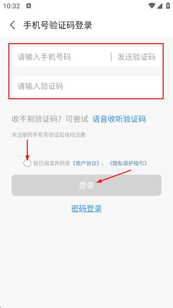4、在手機(jī)號(hào)驗(yàn)證碼登錄界面,輸入手機(jī)號(hào)碼和驗(yàn)證碼,勾選已閱讀并同意相關(guān)協(xié)議后,點(diǎn)擊“登錄”按鈕,完成登錄操作。
