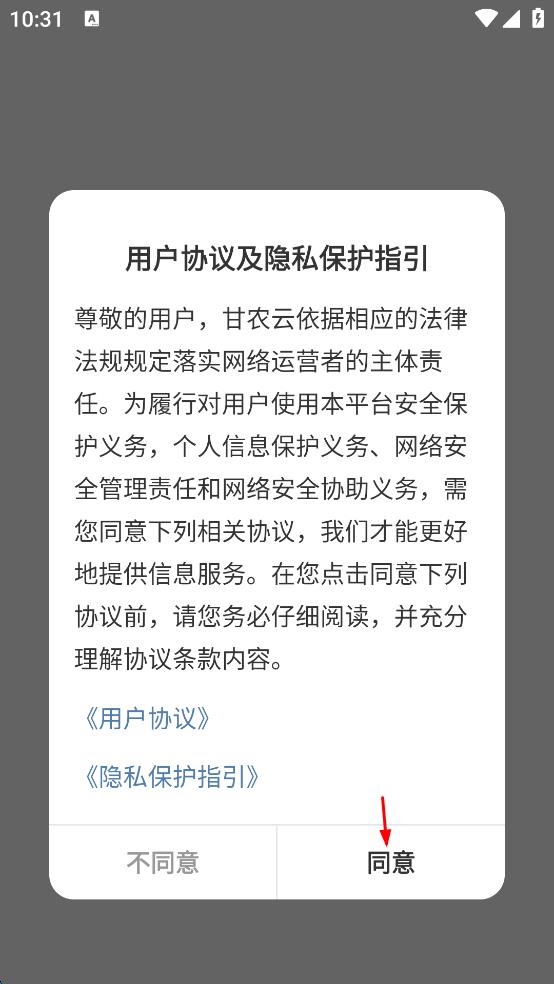 1、打開(kāi)甘農(nóng)云APP,在彈出的用戶協(xié)議及隱私保護(hù)指引頁(yè)面,點(diǎn)擊“同意”按鈕,進(jìn)入APP主界面。