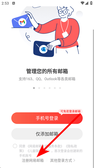 2、同意之后將會(huì)出現(xiàn)手機(jī)號(hào)登錄按鈕以及添加郵箱按鈕,可以點(diǎn)擊下方的同意協(xié)議小圓鈕,并點(diǎn)擊【手機(jī)號(hào)登錄】按鈕;