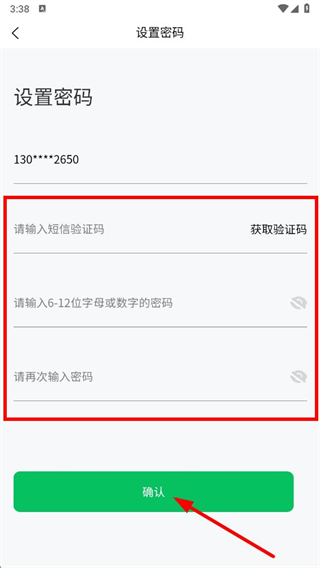 5、在界面點(diǎn)擊獲取驗(yàn)證碼,將接收到的短信驗(yàn)證碼填入,設(shè)置密碼并再次確認(rèn)密碼,最后點(diǎn)擊確認(rèn)完成登錄密碼設(shè)置。