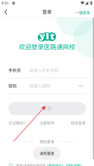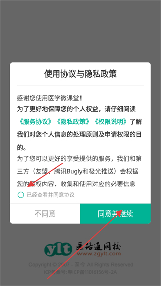 1、打開(kāi)醫(yī)學(xué)微課堂APP,在使用協(xié)議與隱私政策界面,勾選已經(jīng)查看并同意協(xié)議,點(diǎn)擊同意并繼續(xù)。