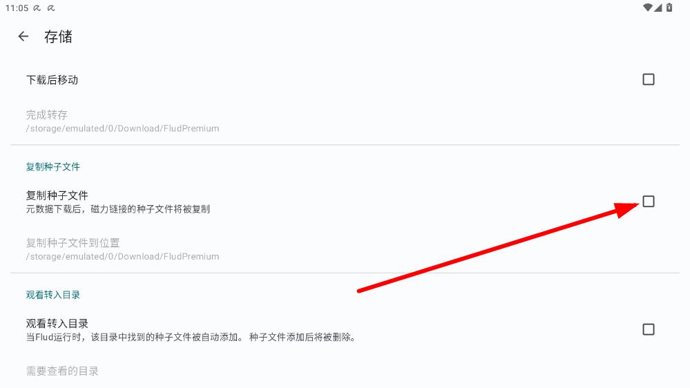 4、在存儲設(shè)置界面中,找到復(fù)制種子文件選項,勾選其右側(cè)的方框,然后可對下方復(fù)制種子文件到位置的路徑進(jìn)行設(shè)置,以指定種子文件存儲位置。