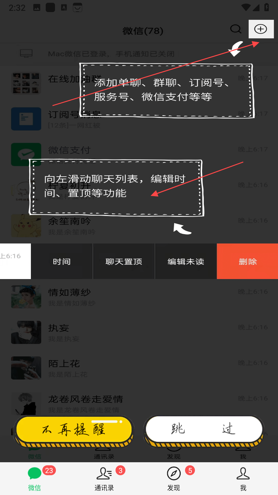1、進(jìn)入模擬微信界面,點(diǎn)擊右上角+號(hào),能添加單聊、群聊、訂閱號(hào)等多種對(duì)象來(lái)豐富聊天列表,向左滑動(dòng)聊天列表中的對(duì)話,可進(jìn)行編輯聊天時(shí)間、標(biāo)記未讀消息等操作。
