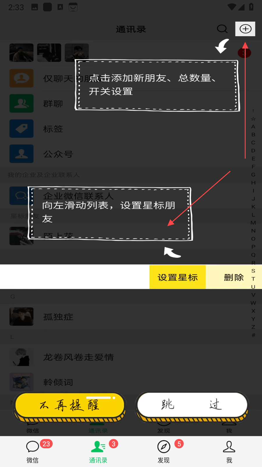 2、切換至通訊錄頁(yè)面,右上角能夠添加新朋友,還可對(duì)好友總數(shù)量進(jìn)行設(shè)置,對(duì)于通訊錄里的聯(lián)系人,向左滑動(dòng)可設(shè)置星標(biāo)朋友,也能進(jìn)行刪除聯(lián)系人操作。