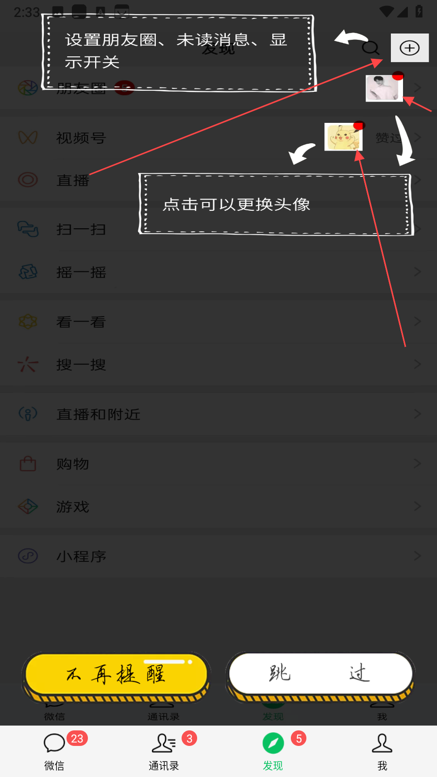 3、進(jìn)入發(fā)現(xiàn)頁(yè)面,通過(guò)相關(guān)設(shè)置項(xiàng)可對(duì)朋友圈、未讀消息顯示等功能進(jìn)行開(kāi)關(guān)設(shè)置,點(diǎn)擊頁(yè)面中的頭像區(qū)域,能更換模擬頭像,還能通過(guò)該頁(yè)面模擬視頻號(hào)、直播、掃一掃等功能。