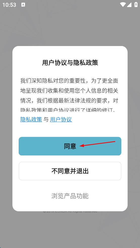 1、打開(kāi)該App,出現(xiàn)用戶(hù)協(xié)議與隱私政策彈窗,閱讀后點(diǎn)擊同意按鈕。