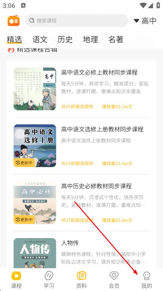 1、打開螺螄大語文應(yīng)用,點擊底部導(dǎo)航欄中的我的選項。