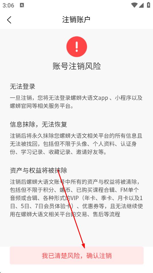 4、閱讀相關(guān)風(fēng)險提示后,點擊我已清楚風(fēng)險,確認注銷按鈕,即可完成賬號注銷。
