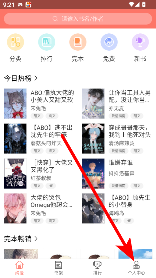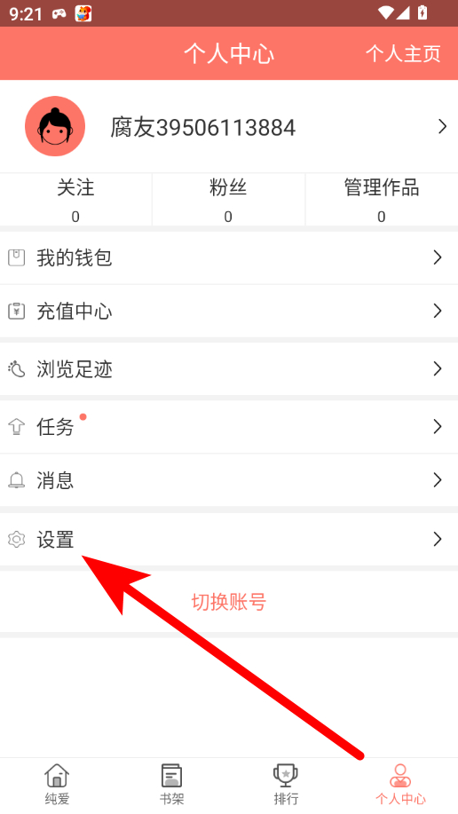 1、在腐萌小說app界面,點擊底部導航欄中的個人中心選項,進入個人中心頁面。