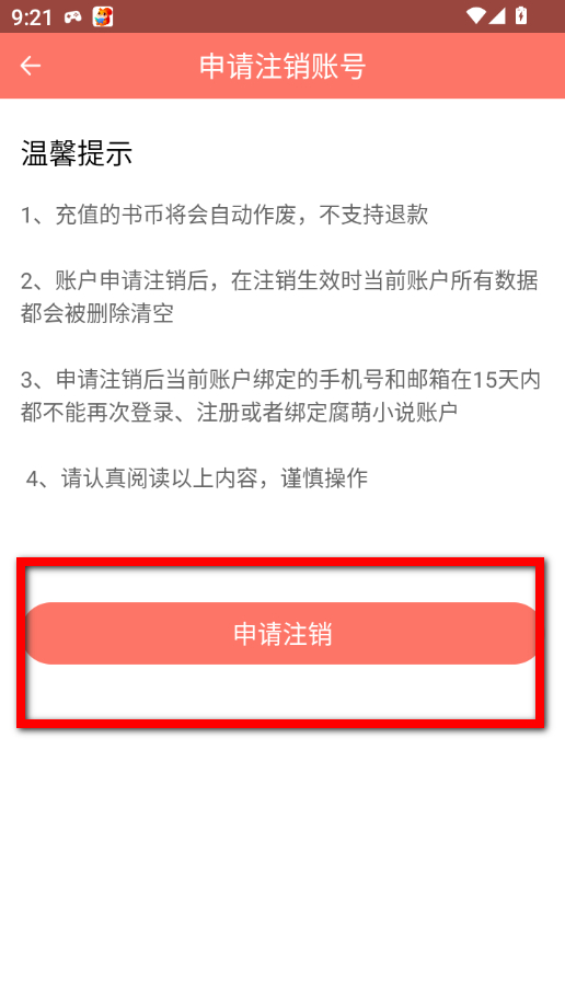 4、在申請注銷賬號頁面,閱讀溫馨提示后,點擊申請注銷按鈕,按提示完成賬號注銷操作。