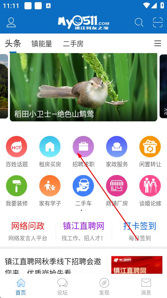1、打開my0511App進入首頁,點擊招聘求職圖標(biāo),進入鎮(zhèn)江直聘網(wǎng)。