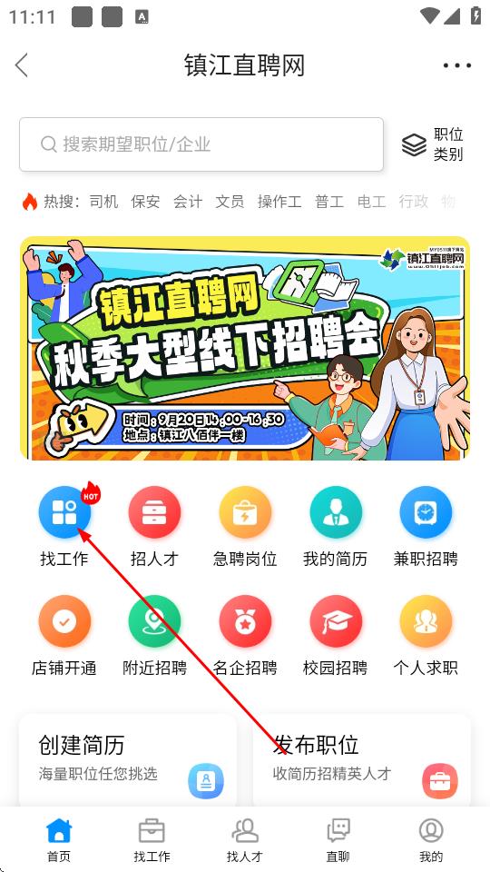 2、在鎮(zhèn)江直聘網(wǎng)頁面,點擊找工作按鈕。