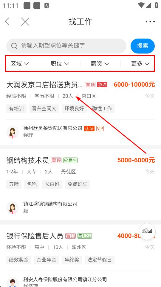 3、進入找工作頁面后,可以通過篩選條件,對招聘信息進行篩選,找到感興趣的職位后,點擊進入職位詳情頁面。