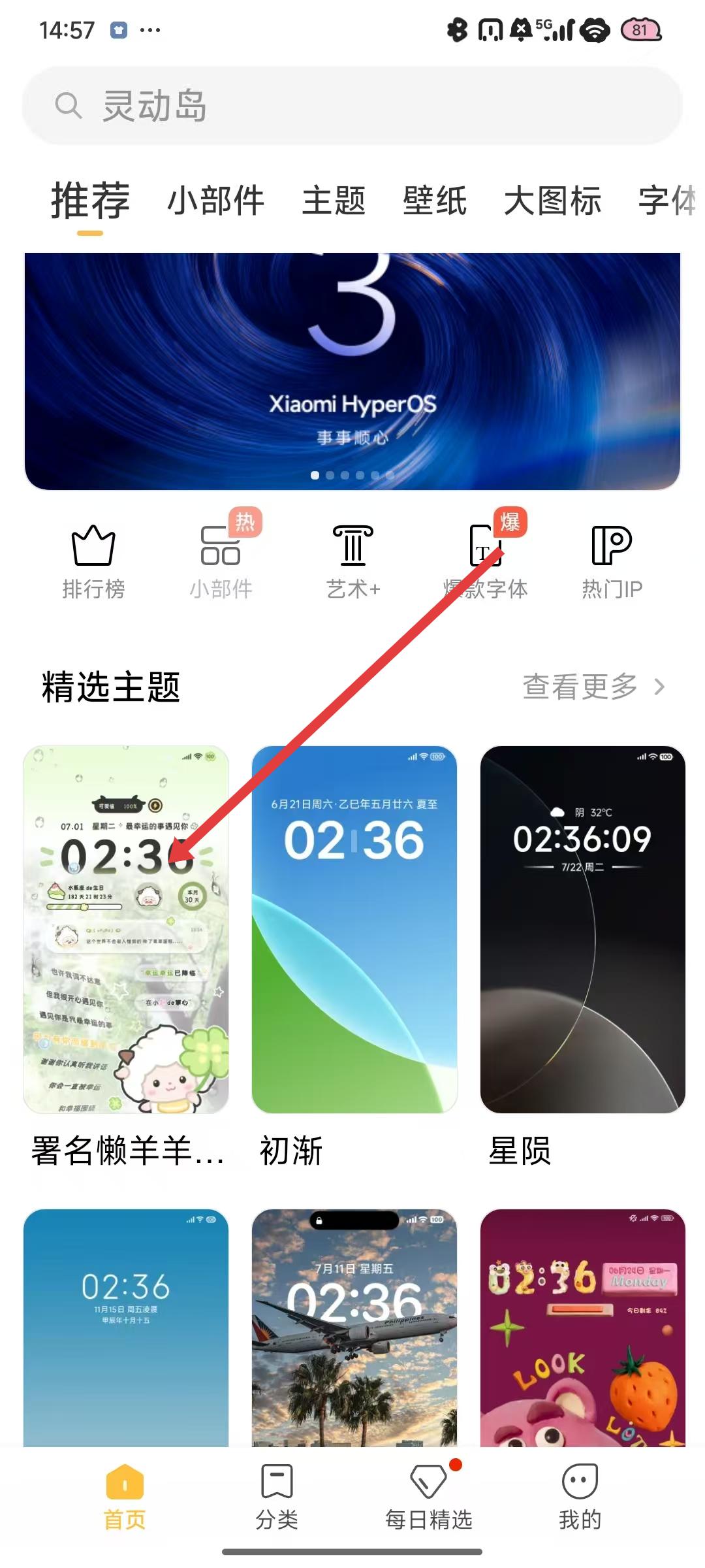 1、打開小米手機的主題壁紙應用,在推薦頁面的精選主題板塊,瀏覽并找到如署名懶羊羊...等自己喜歡的主題。