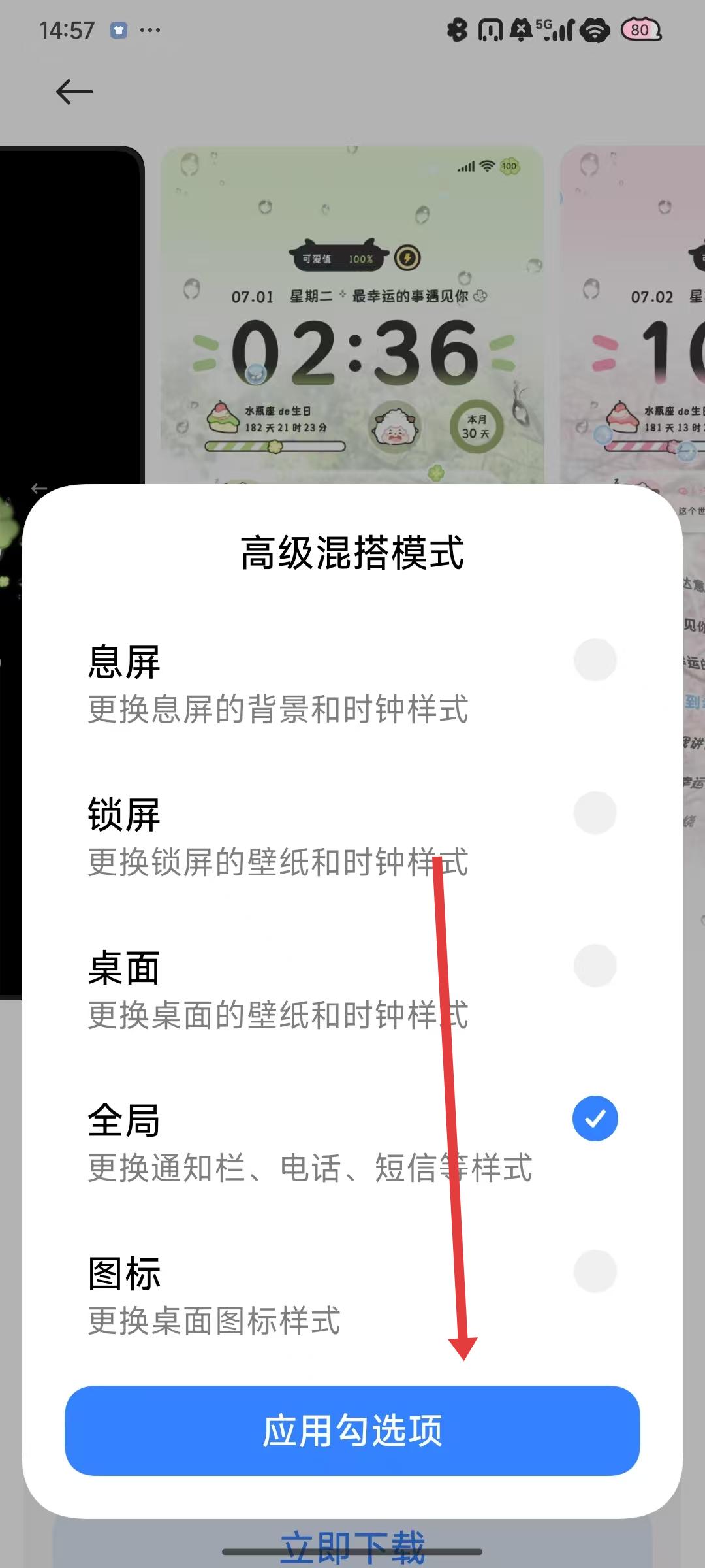 3、下載完成后,若出現高級混搭模式彈窗,可按需勾選息屏、鎖屏等選項,最后點擊應用勾選項即可完成主題設置。