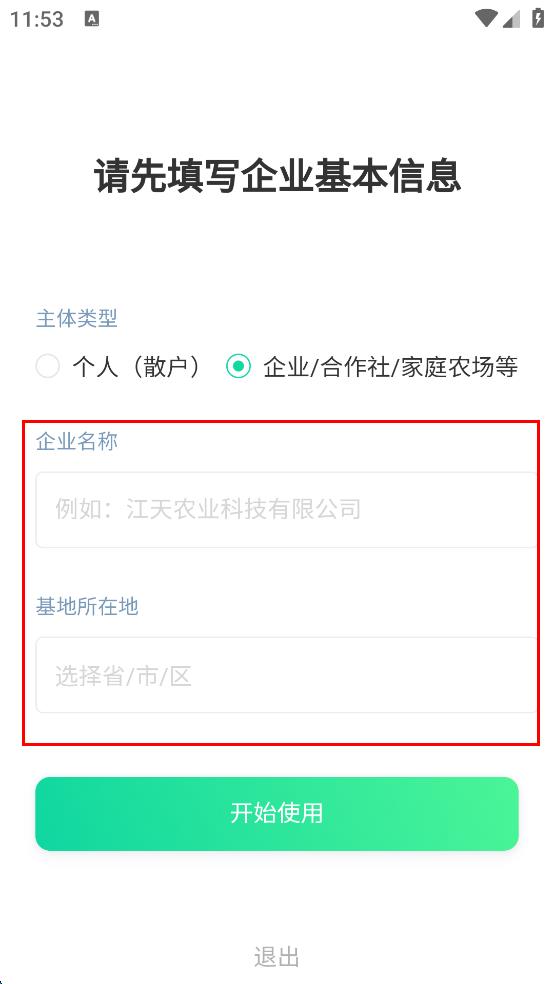 3、登錄后選擇主體類型,若為個(gè)人,填寫姓名和地塊位置;若為企業(yè)等,填寫企業(yè)名稱和基地所在地。