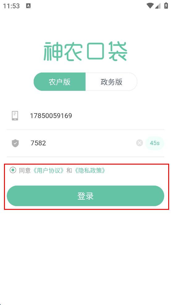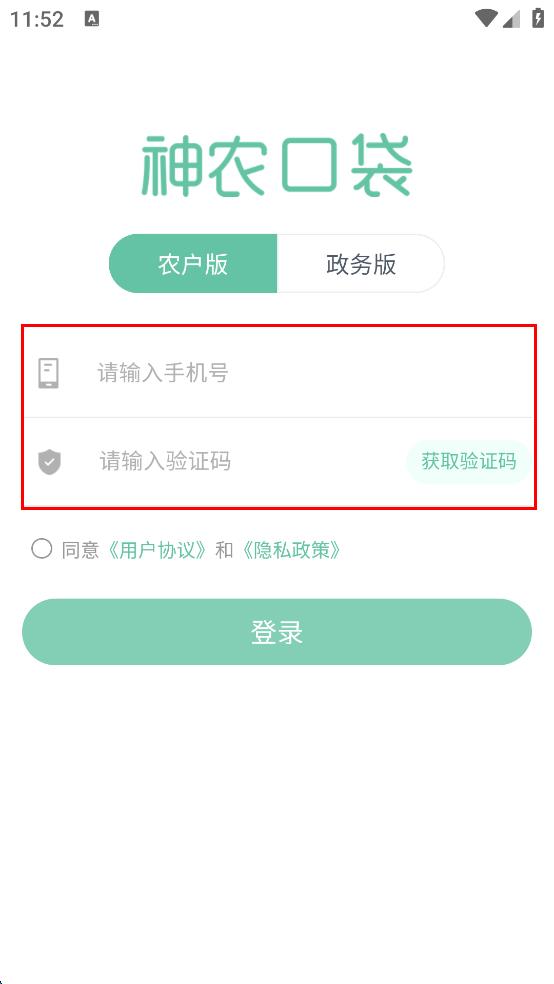 1、打開神農(nóng)口袋APP農(nóng)戶版,輸入手機(jī)號(hào),點(diǎn)擊“獲取驗(yàn)證碼”并輸入驗(yàn)證碼。