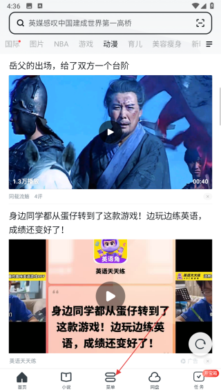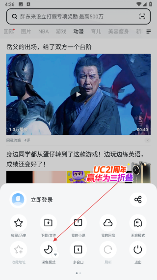 1、打開UC瀏覽器極速版,進入首頁后點擊底部中間的菜單按鈕,展開功能選項面板。