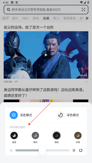 3、在深色模式設(shè)置面板中,在深色模式偏好下選擇通透,柔和,暗夜,護眼等風(fēng)格,或拖動亮度條調(diào)整深色模式的亮度,完成深色模式設(shè)置的更改。
