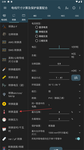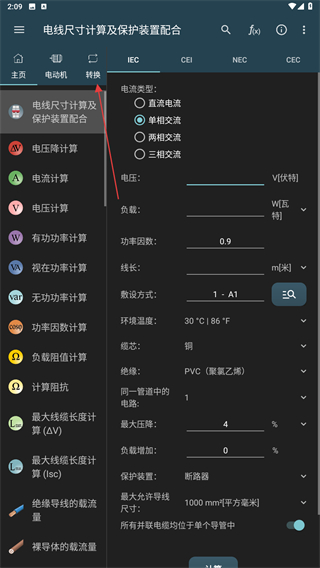 電氣計算器app是一款專為電氣行業(yè)而打造的公式計算器軟件,主要是根據(jù)電理學制作,融入了電工的實際計算需求,為用戶提供電壓降、電流、電壓、有功功率、電機轉(zhuǎn)速、電機效率等多達幾十種電工計算,分類詳細,覆蓋電動機、轉(zhuǎn)換、引腳定義、公式、資料等各個方面,可以幫助用戶輕松快速的計算出各項電工工作問題,您還在等什么,喜歡就來下載體驗唄。