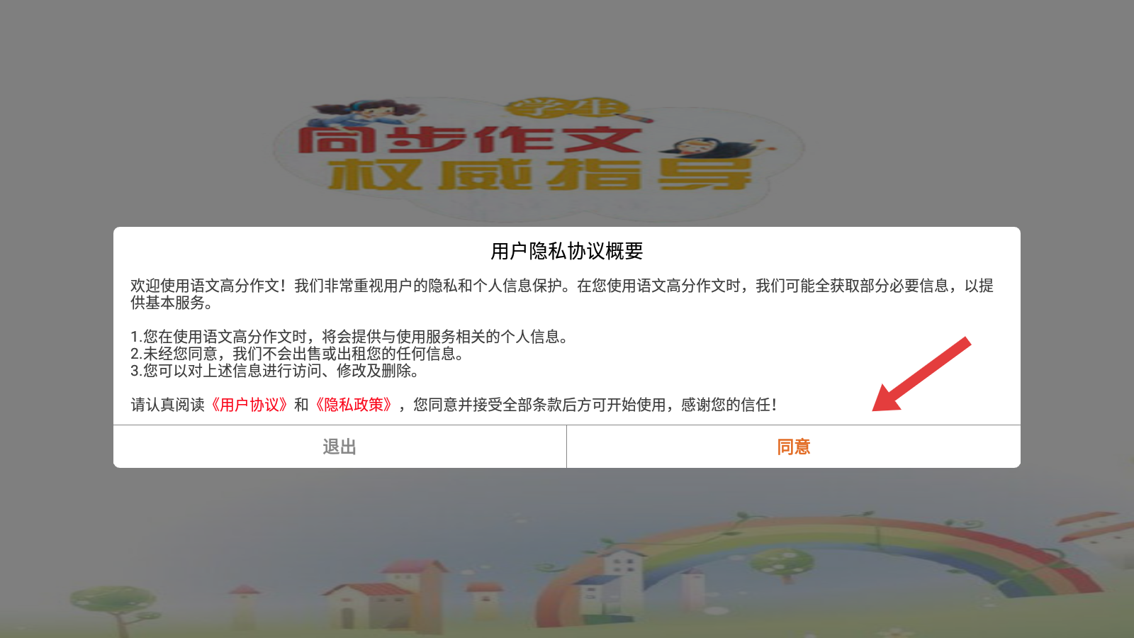 1、打開語文高分作文APP,閱讀用戶隱私協(xié)議概要后,點(diǎn)擊同意按鈕,進(jìn)入應(yīng)用主界面開始使用。