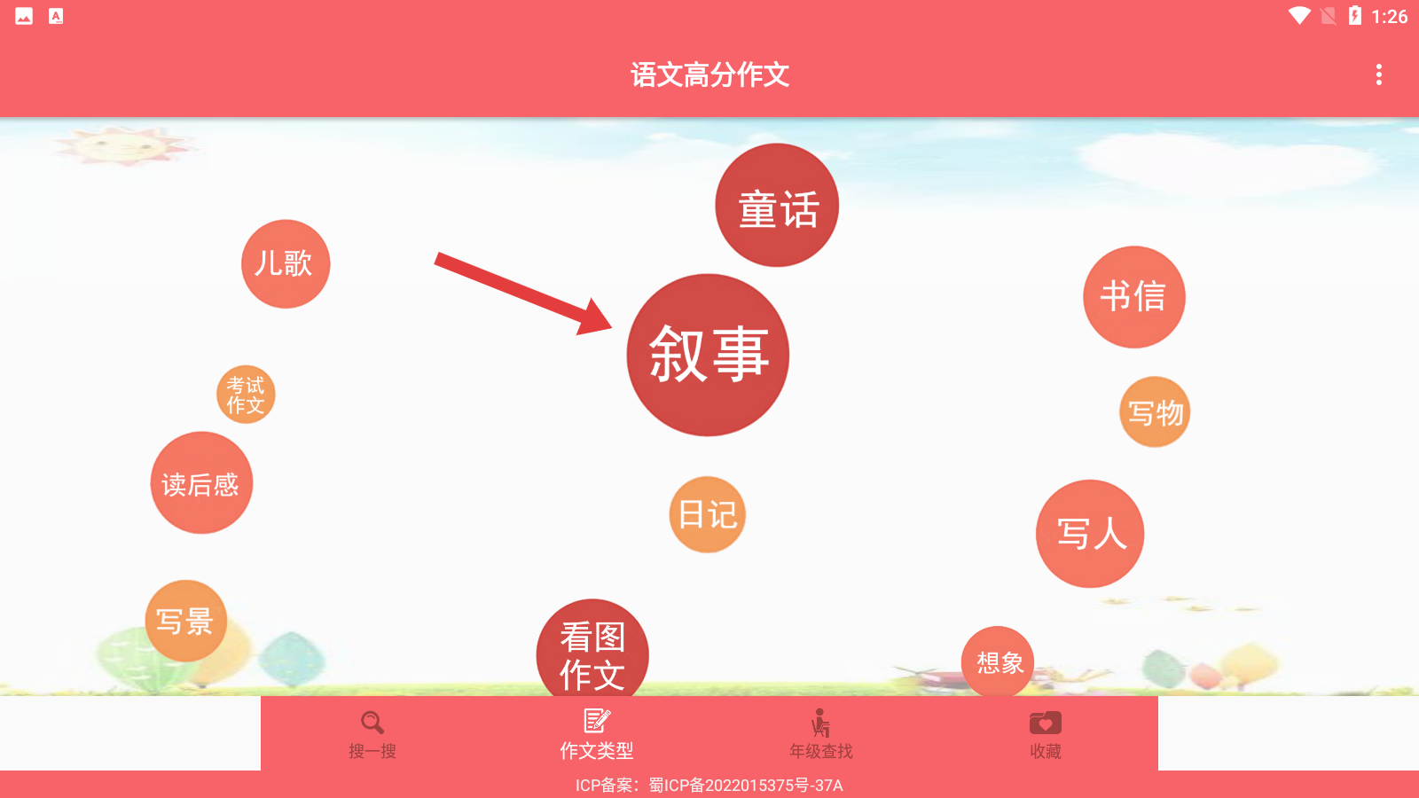 2、在應(yīng)用作文類型頁面,找到紅色圓形的敘事選項(xiàng)并點(diǎn)擊,進(jìn)入敘事類作文內(nèi)容瀏覽界面。