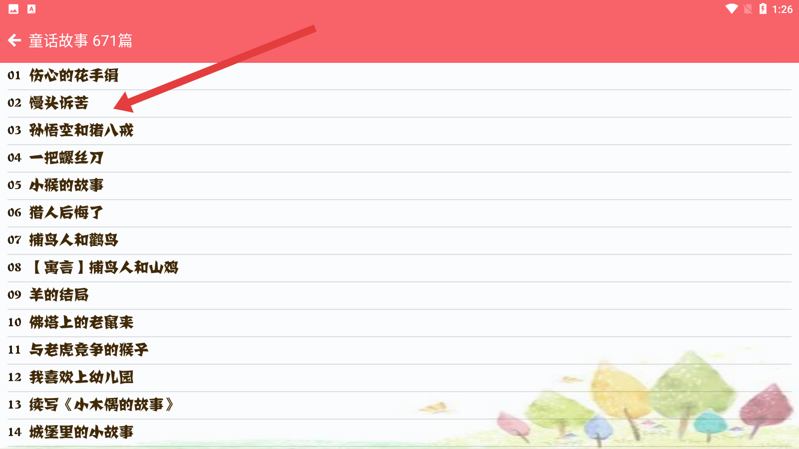 3、進(jìn)入童話故事列表,點(diǎn)擊序號(hào)02的饅頭訴苦篇目,查看該童話故事的具體內(nèi)容以獲取寫作參考。