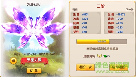 羽翼升級(jí)需要大量的羽翼精華來(lái)完成,每一次點(diǎn)擊進(jìn)階一次,都有一定概率能使羽翼直接進(jìn)階成功,當(dāng)然玩家也可以直接點(diǎn)擊自動(dòng)進(jìn)階,等到幸運(yùn)值進(jìn)度條滿后,羽翼就必定進(jìn)階成功了.