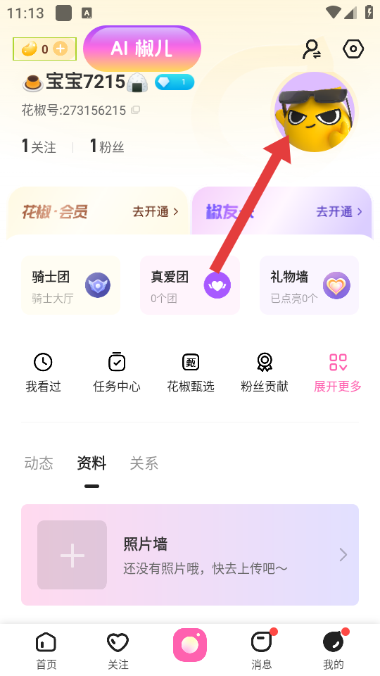 1、打開花椒直播APP,進入我的頁面,點擊右上角的個人頭像,進入更換頭像界面。
