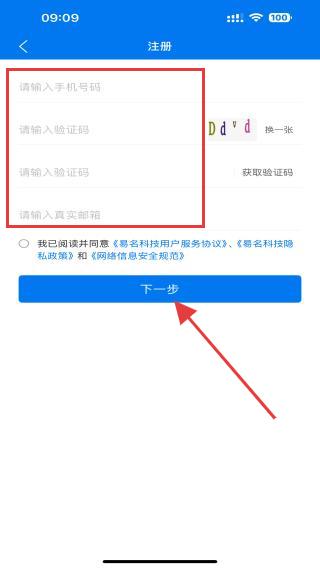 4、在注冊頁面內(nèi),輸入手機(jī)號、驗(yàn)證碼以及郵箱,再點(diǎn)擊下一步即可。