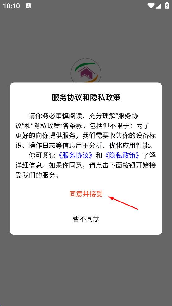 1、打開勞務(wù)相關(guān)軟件,在彈出的服務(wù)協(xié)議和隱私政策頁面,點擊同意并接受,進入軟件首頁。