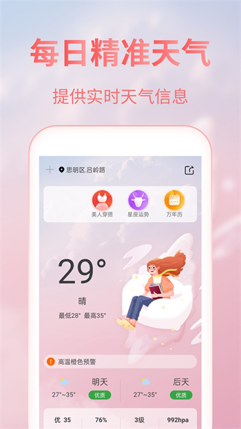美人天氣app是全新的查看天氣的軟件,可查看國內外多個城市的天氣預報、空氣質量等,方便人們出行,數(shù)據(jù)精準,溫馨提示用戶加減衣服,界面清新,非常適合小女生,畫面唯美,快來這里點擊下載體驗看看吧!