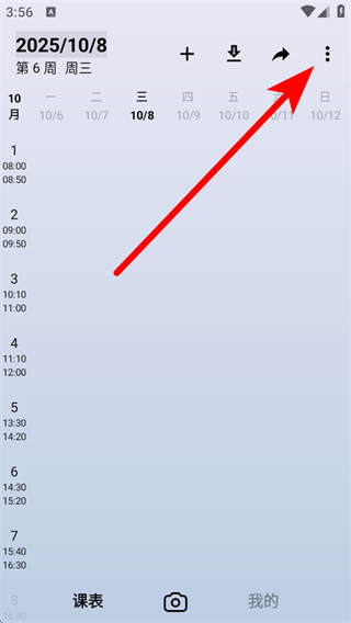 1、在wakeup課表的頁(yè)面,點(diǎn)擊右上角三點(diǎn)菜單圖標(biāo),彈出功能選項(xiàng)。