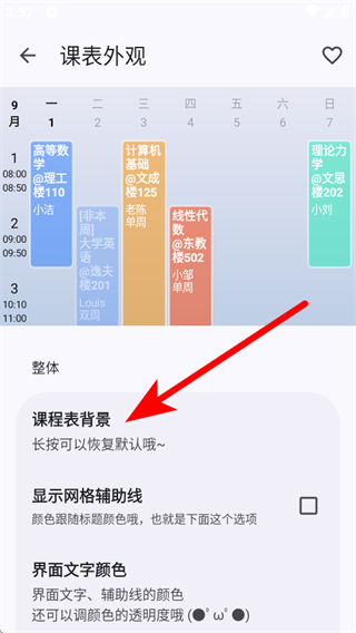 4、在課表外觀頁(yè)面,找到課程表背景,按提示進(jìn)行背景更換操作。