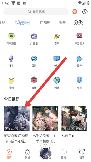 1、打開(kāi)貓耳FM,在首頁(yè)選擇自己想要下載的音頻并點(diǎn)擊進(jìn)入播放界面。