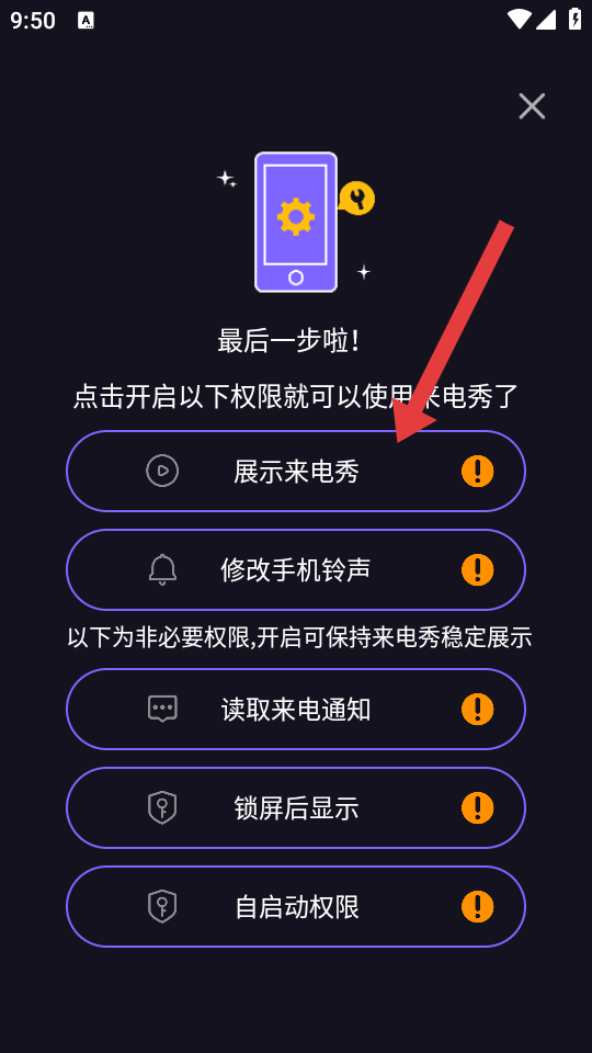 3、在最后一步啦權(quán)限提示頁面,點擊展示來電秀的選項,處理來電秀所需權(quán)限。
