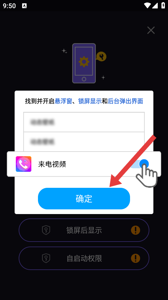 4、在彈出的來電視頻權(quán)限開啟窗口中,開啟對應(yīng)權(quán)限后點擊確定,即可完成來電秀設(shè)置。