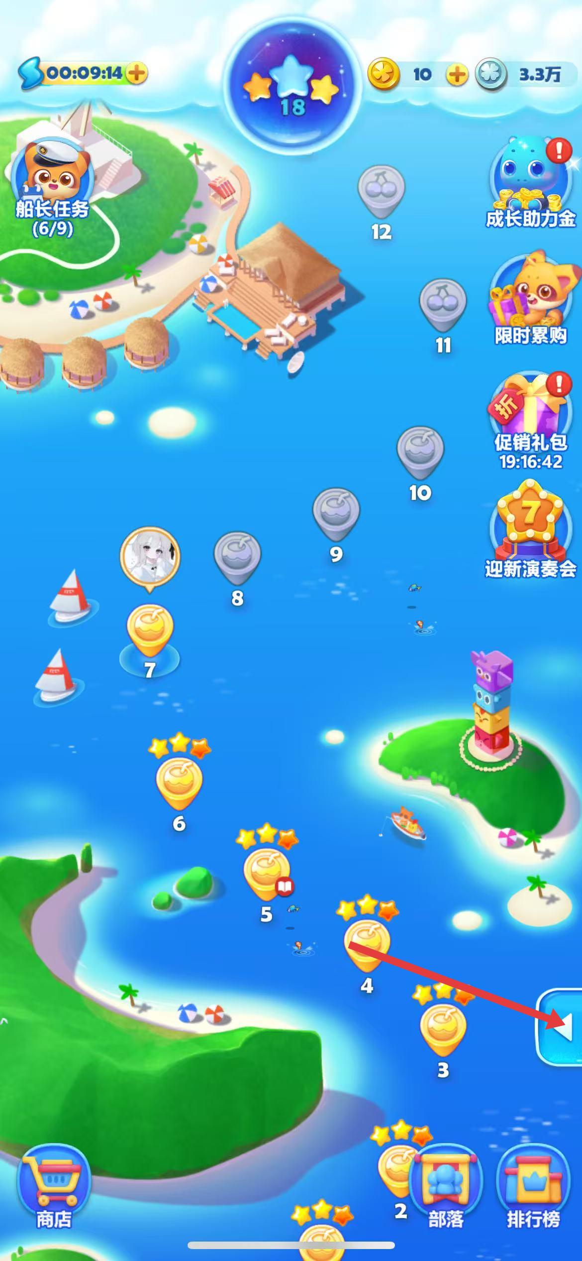 海星下方有一個(gè)進(jìn)度條,通關(guān)在周?chē)粩嗟叵P牵@樣就可以逐漸的積攢能量值。當(dāng)能量值達(dá)到最后滿值的時(shí)候,海星就會(huì)飛出界面。在飛出的同時(shí),還會(huì)有更多的冰棒與福袋贈(zèng)送給我們。還有增加步數(shù)的元素呢。
