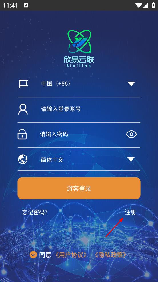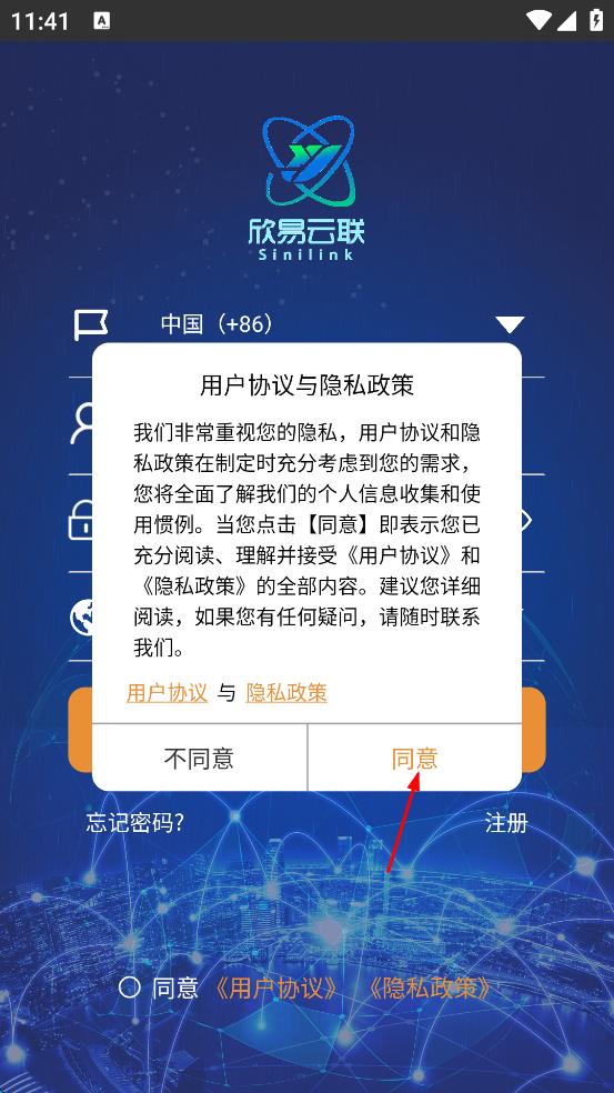 1、打開欣易云聯(lián),會出現(xiàn)用戶協(xié)議與隱私政策界面,仔細(xì)閱讀后點(diǎn)擊“同意”,進(jìn)入登錄頁面。