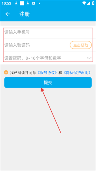 4、輸入手機號、驗證碼、設置密碼,勾選服務協(xié)議,點擊提交完成注冊。