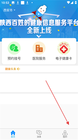 1、打開健康陜西app,進入首頁,點擊底部導航欄中的我的選項。