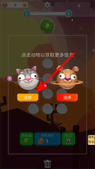 1、進(jìn)入游戲界面后,點(diǎn)擊寵物下方的選擇按鈕,選定初始寵物角色,開(kāi)啟游戲冒險(xiǎn),這是進(jìn)入的關(guān)鍵操作。