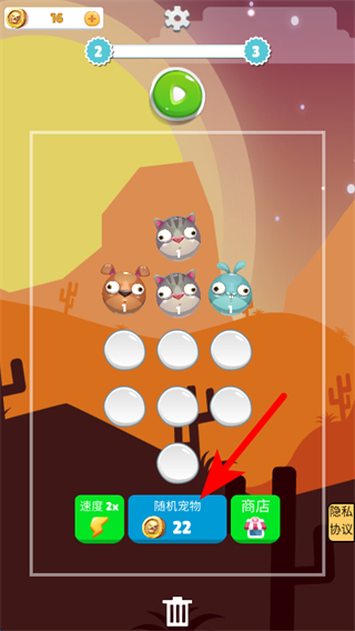 3、點(diǎn)擊隨機(jī)寵物按鈕,消耗金幣購(gòu)買隨機(jī)寵物,擴(kuò)充寵物種類,填充寵物格子,豐富收集內(nèi)容,推進(jìn)進(jìn)度。