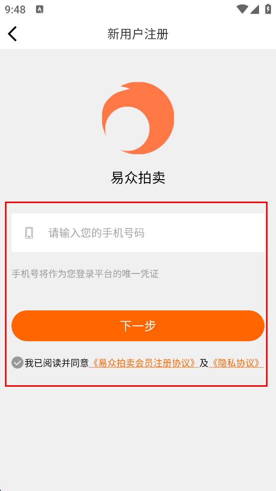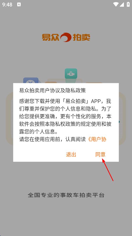 1、打開易眾拍賣APP,在彈出的用戶協(xié)議及隱私政策提示框中,點擊同意。