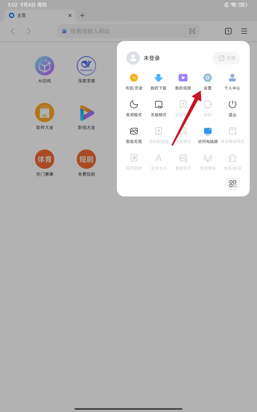 1、打開小米手機(jī)的瀏覽器應(yīng)用,點(diǎn)擊右上角三橫線菜單圖標(biāo),在彈出菜單中點(diǎn)擊設(shè)置。