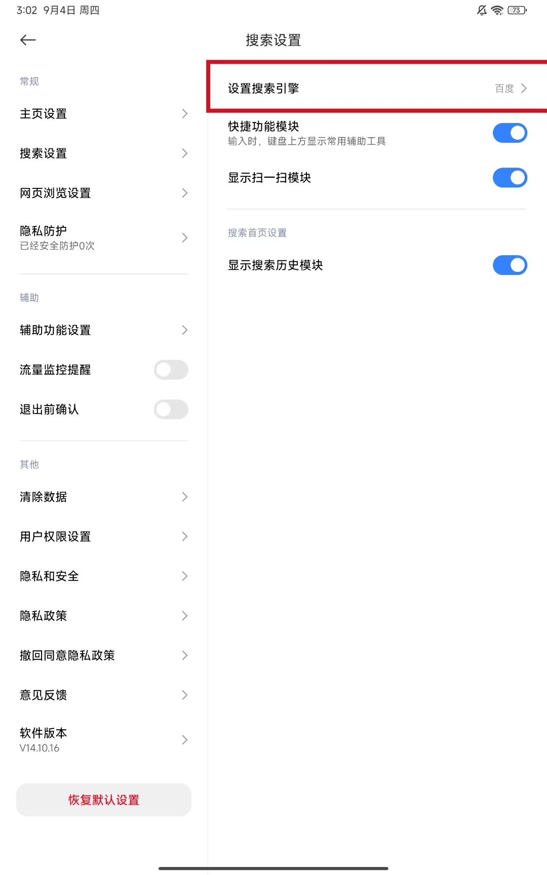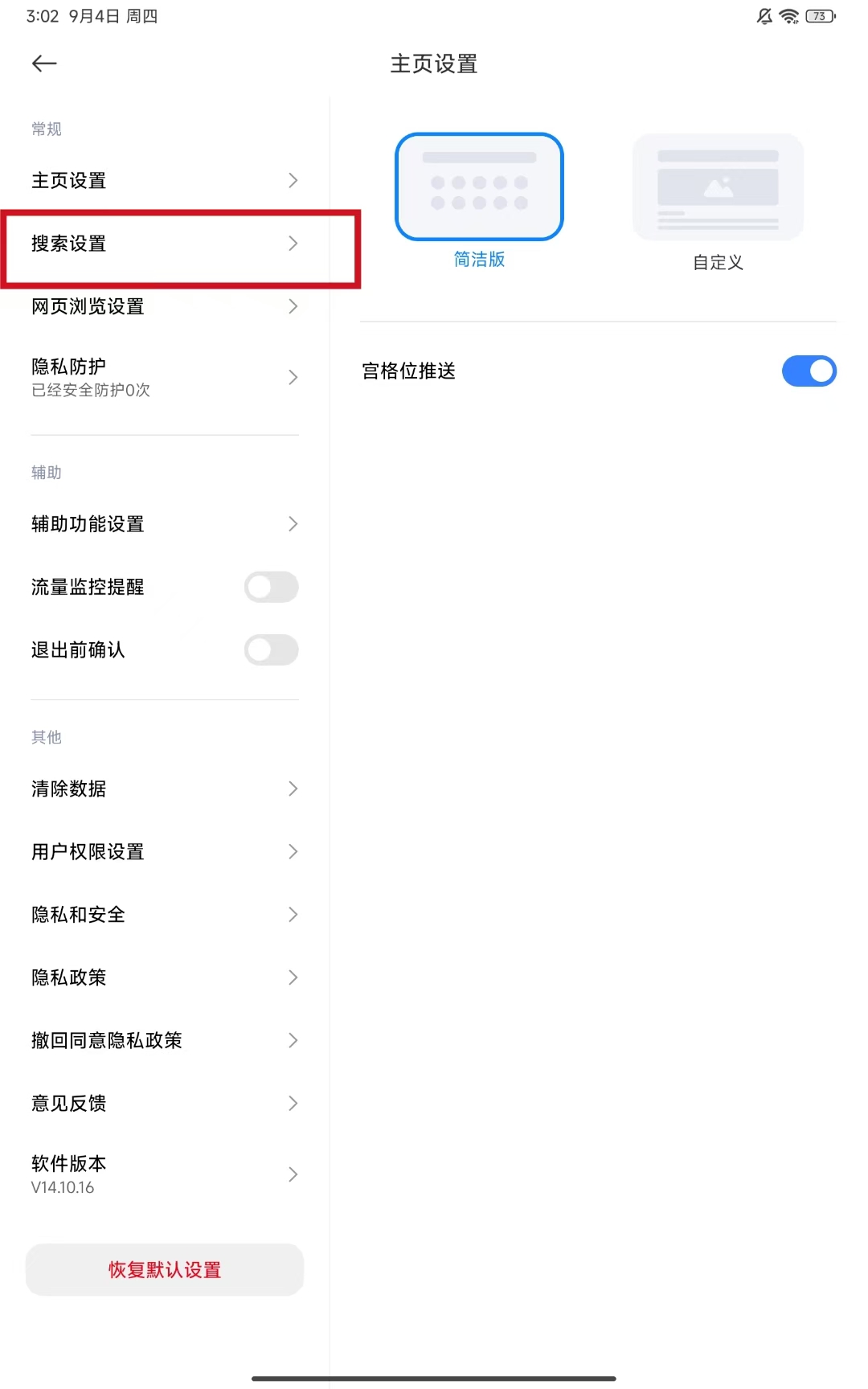 2、進(jìn)入設(shè)置頁面后,點(diǎn)擊搜索設(shè)置選項(xiàng),進(jìn)入搜索相關(guān)設(shè)置界面。