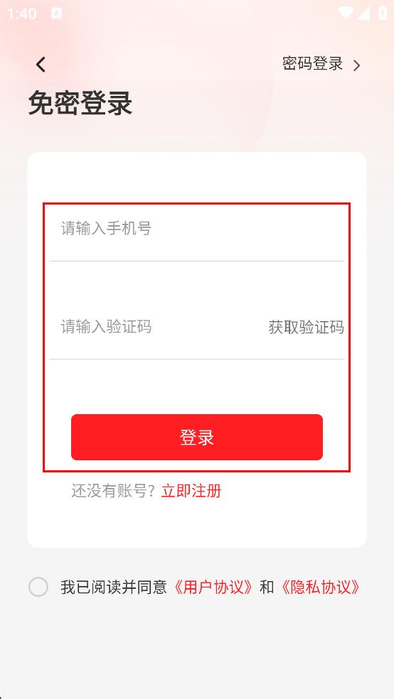 4、在免密登錄界面輸入手機號,點擊獲取驗證碼,輸入驗證碼,勾選已閱讀并同意相關(guān)協(xié)議后點擊登錄,完成登錄操作。