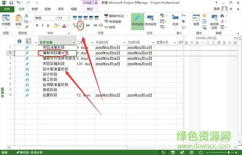 5、有些任務(wù)是某個(gè)階段下的子任務(wù),需要要project調(diào)整一下級(jí)別,即階級(jí),選擇要階級(jí)的任務(wù),如編制項(xiàng)目建議書(shū),然后點(diǎn)擊任務(wù)功能區(qū)中的降級(jí)任務(wù)按鈕;