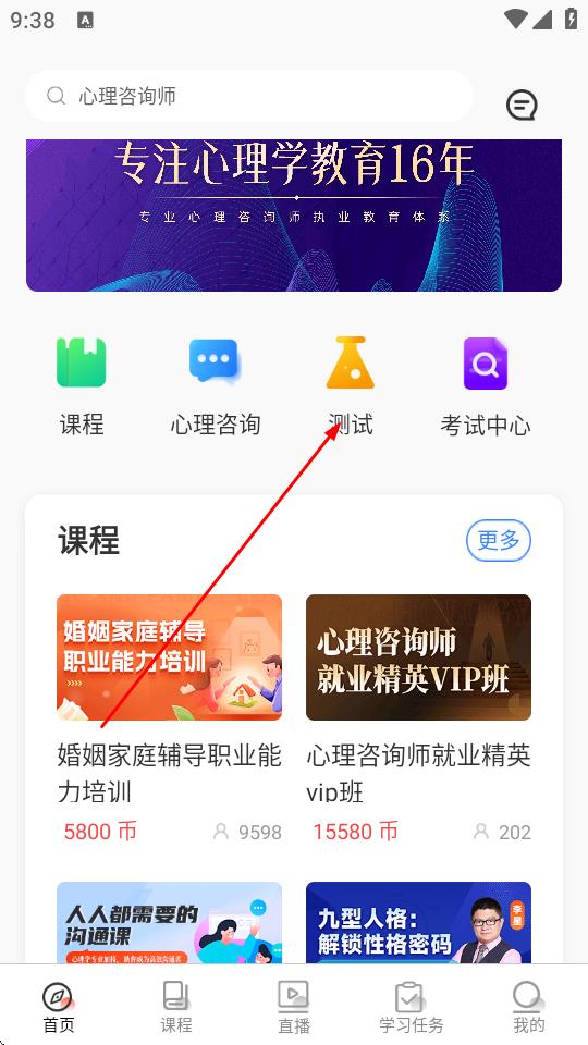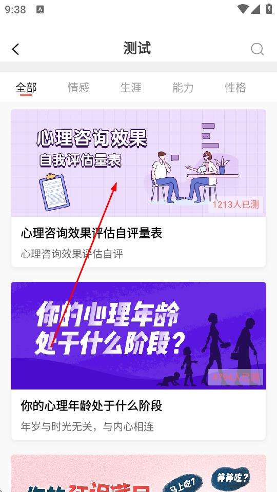 3、在“測試”頁面,瀏覽各類心理測試項(xiàng)目,選擇感興趣的心理健康測試,如心理咨詢效果自我評估量表。