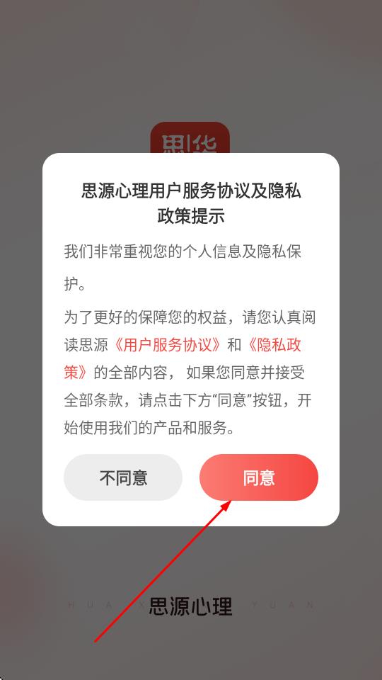 1、打開思源心理APP,在出現(xiàn)的思源心理用戶服務(wù)協(xié)議及隱私政策提示頁面,點(diǎn)擊同意。